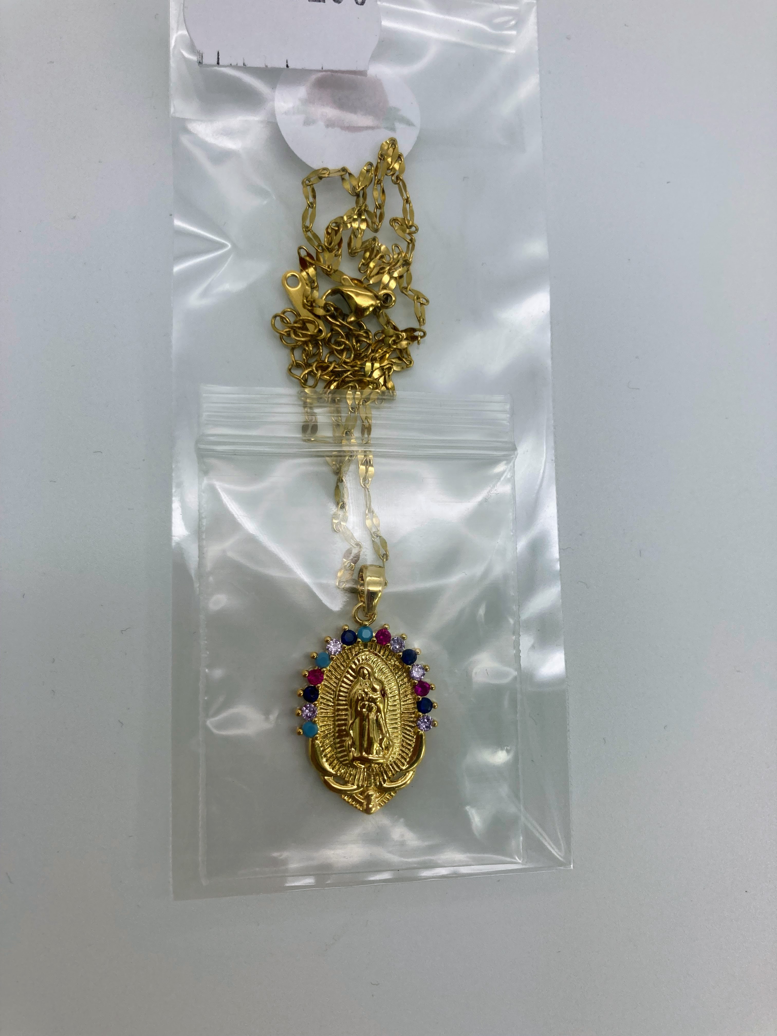 Madonna Anhänger mit Kette goldfarben, bunte Glassteine
