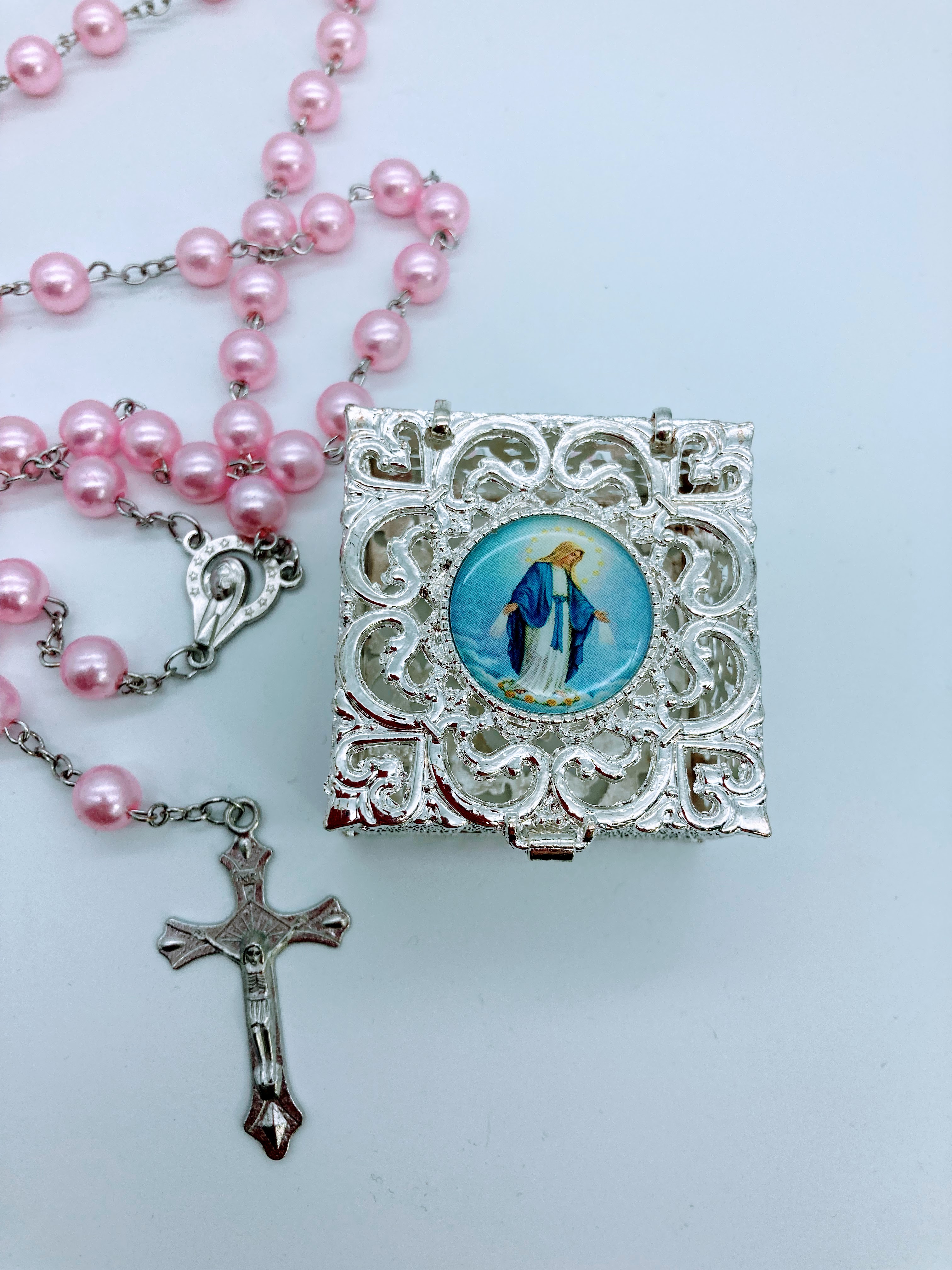 Großer wunderschöner Rosenkranz mit Herzen und Strass-Amulett der Jungfrau Maria mit Rose.