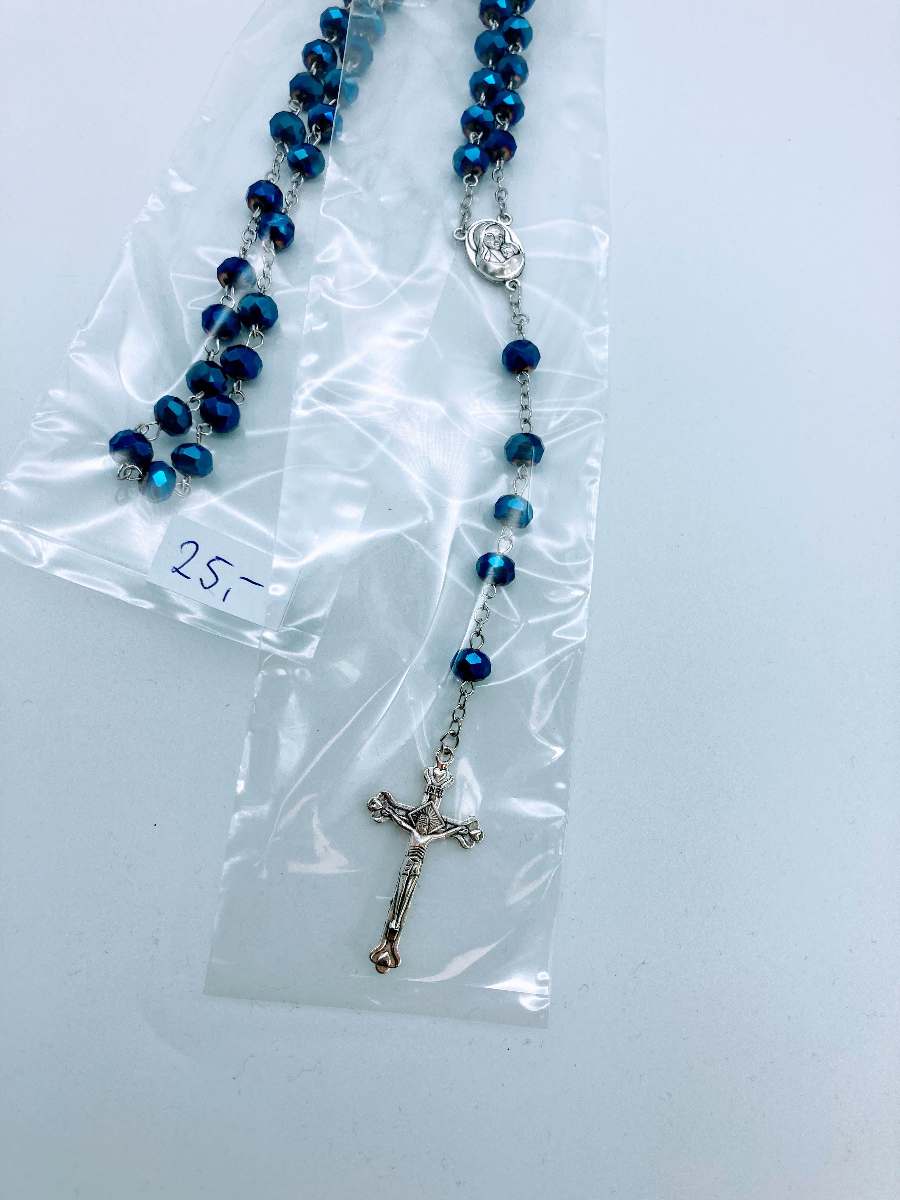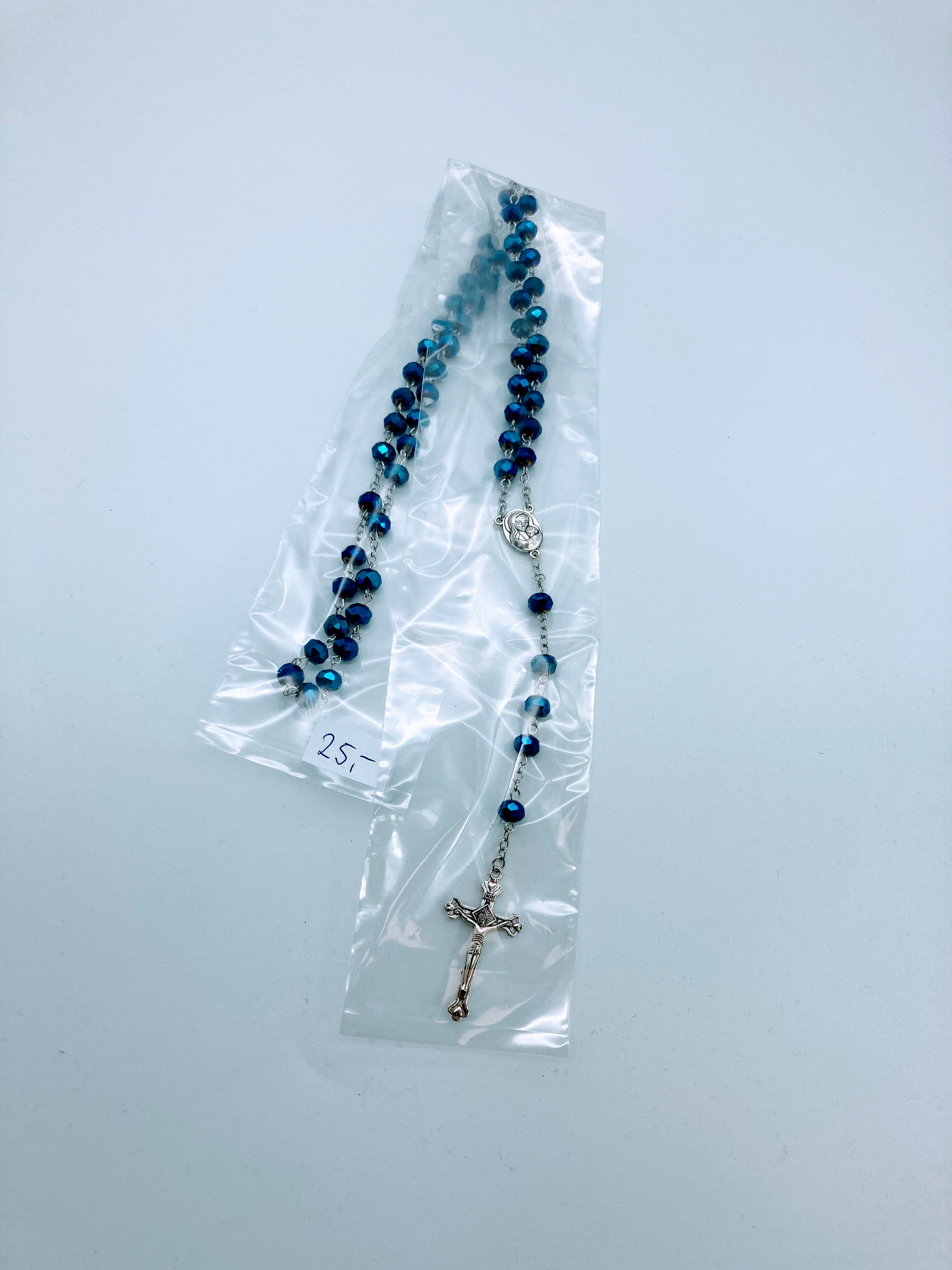 wunderschöner Rosenkranz petrol facettierte Kristalle, silberfarbenes Amulett und Jesuskreuz